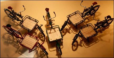 Es gab diese Art Lasten- oder Transporträder für Lasten schon Anfang 1900.Auch heute erleben diese Räder ihre Wiederauferstehung.und zwar fahren in Großstädten Kurierdienste mit solchen Rädern, nur modifiziert, im Stadtzentrum ihre Pakete aus, da es für Kraftfahrzeuge zu wenig Parkraum gibt.So werden auch wir diese Räder in verschiedenen Ausfertigungen mit Kästen oder Kisten mit Deckel bauen.Auf den Bildern ist auch eine Version mit einem Flechtkorb von unserem Miniatur Korbflechter Waldemar Backert zu sehen. So wurde z.B. früher die Mangelwäsche ausgefahren.Auch könnte man kleine Kinder in diesen Korb hinein dekorieren. Das ergibt eine sehr schöne Szene, die für sich schon viel herzeigt.