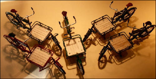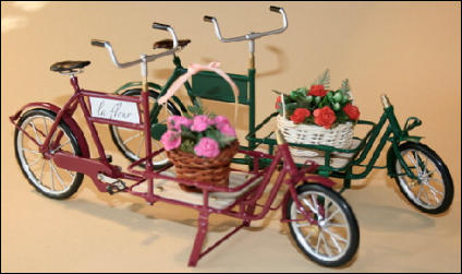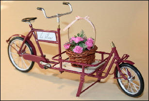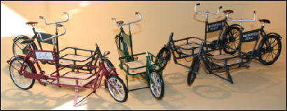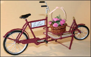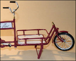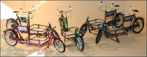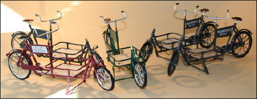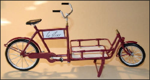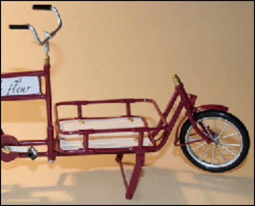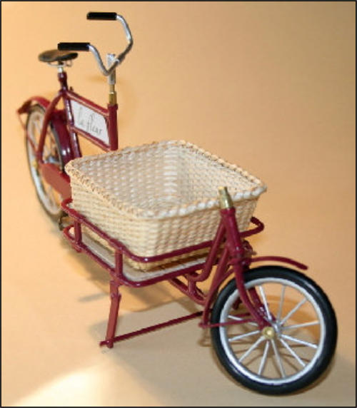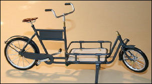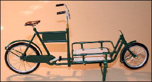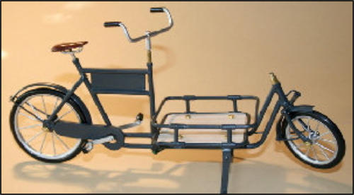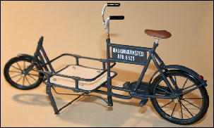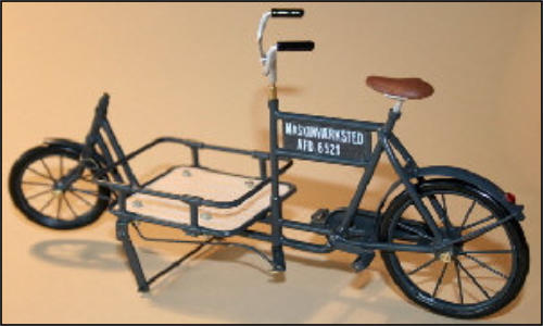 Es gab diese Art Lasten- oder Transporträder für Lasten schon Anfang 1900.Auch heute erleben diese Räder ihre Wiederauferstehung.und zwar fahren in Großstädten Kurierdienste mit solchen Rädern, nur modifiziert, im Stadtzentrum ihre Pakete aus, da es für Kraftfahrzeuge zu wenig Parkraum gibt.So werden auch wir diese Räder in verschiedenen Ausfertigungen mit Kästen oder Kisten mit Deckel bauen.Auf den Bildern ist auch eine Version mit einem Flechtkorb von unserem Miniatur Korbflechter Waldemar Backert zu sehen. So wurde z.B. früher die Mangelwäsche ausgefahren.Auch könnte man kleine Kinder in diesen Korb hinein dekorieren. Das ergibt eine sehr schöne Szene, die für sich schon viel herzeigt.